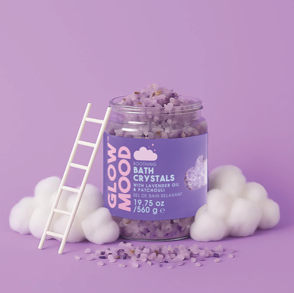 Unwind with our Glow Mood Night Bath Crystals. Formulated with lavender and patchouli essential oils, these soothing salts dissolve in warm water, creating a calming bath experience that nurtures your mind and body.